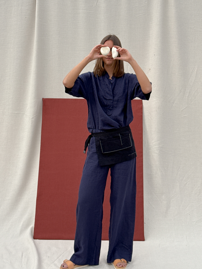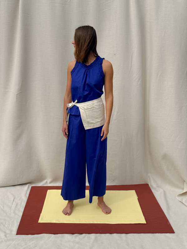 pippa pants fant shop online canvas deadstock cotton azure organic cotton The Netherlands model front Total look