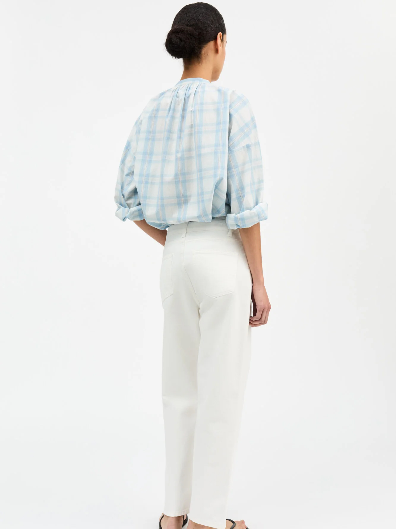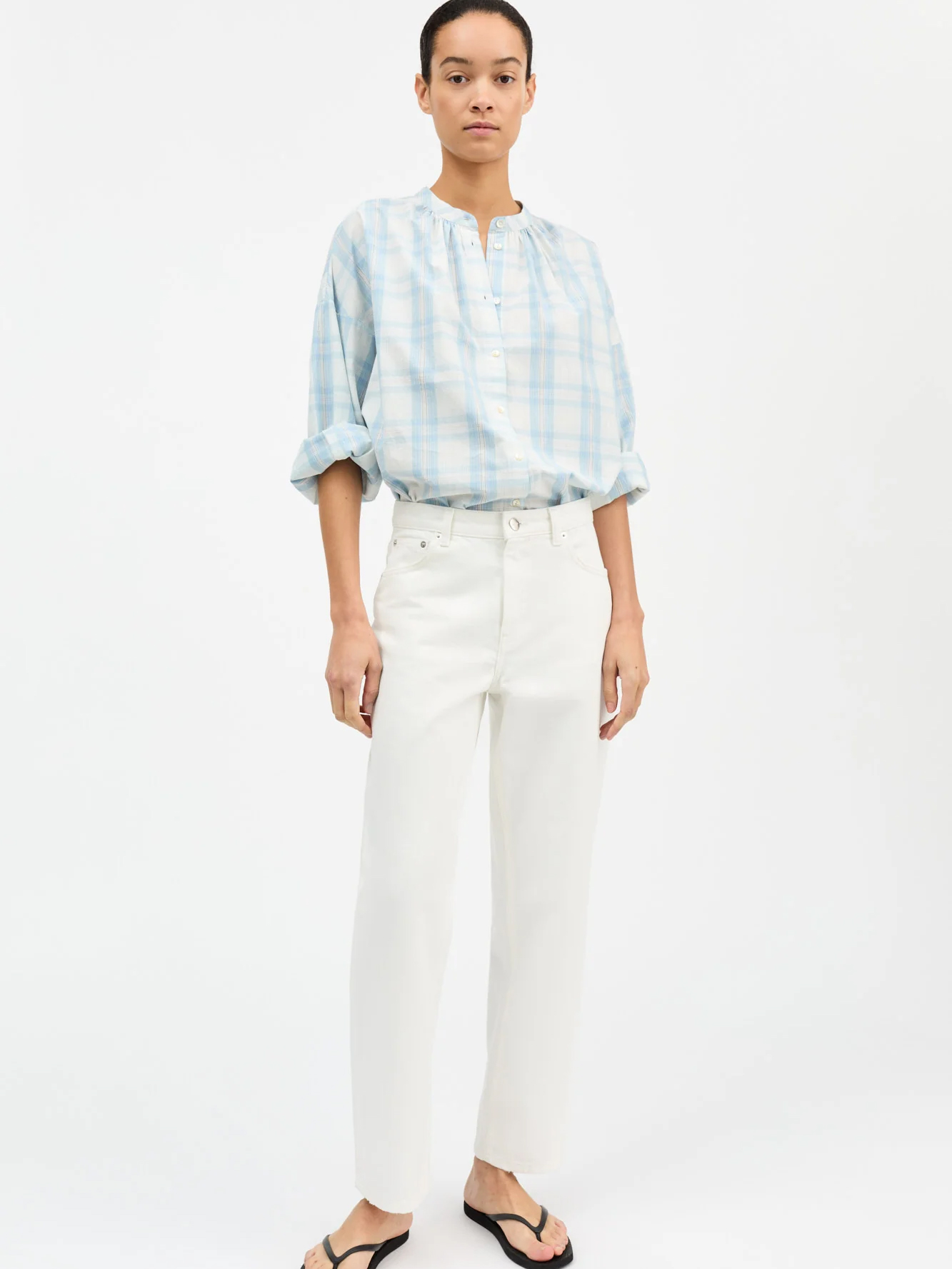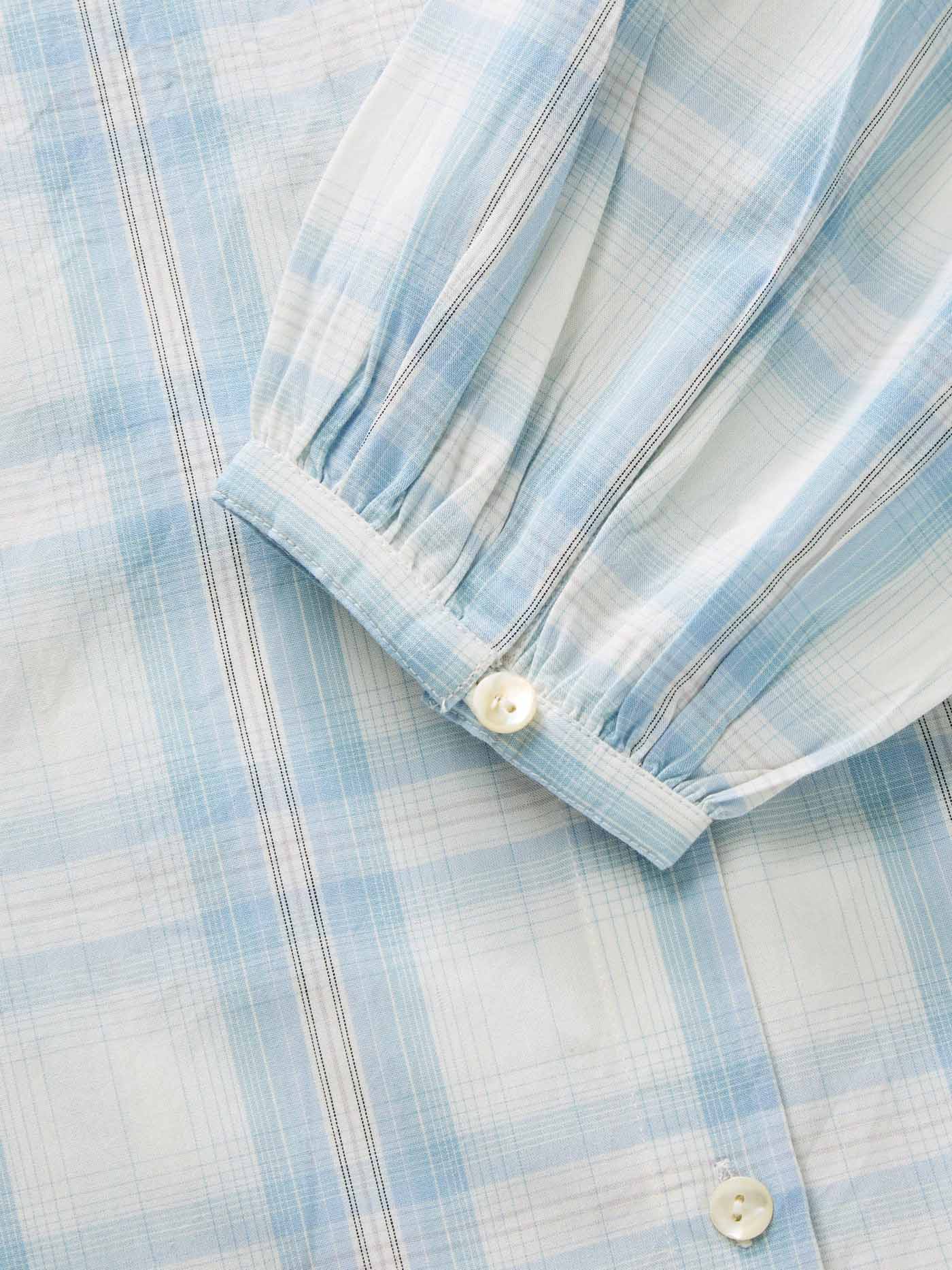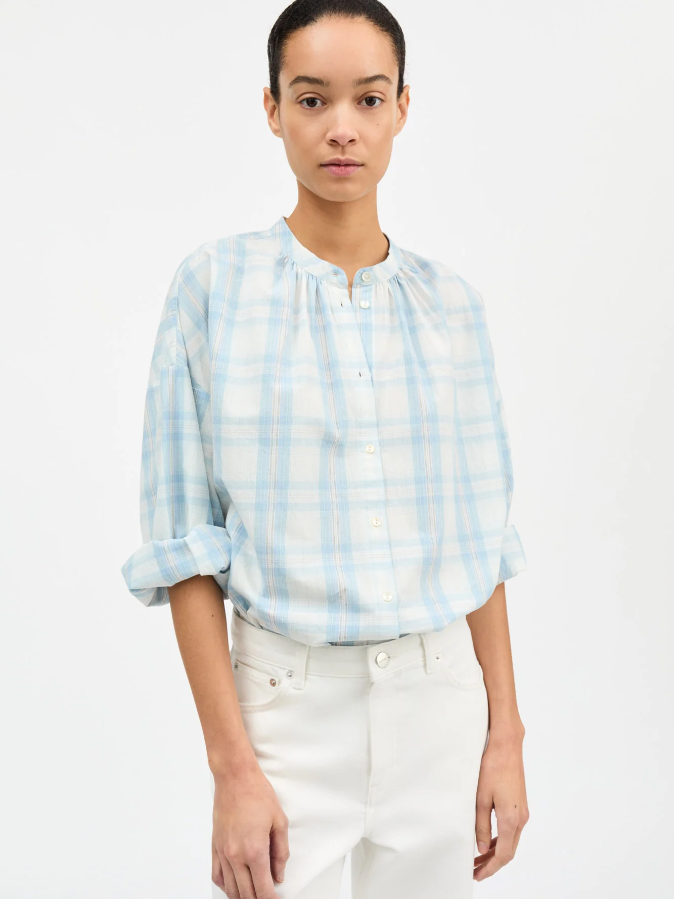 Cilla shirt is a voluminous shirt and it has a round neck with no collar, long, voluminous sleeves and buttons all the way down.