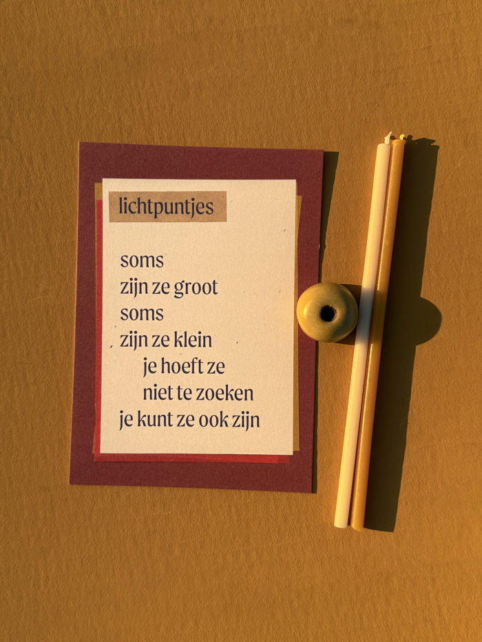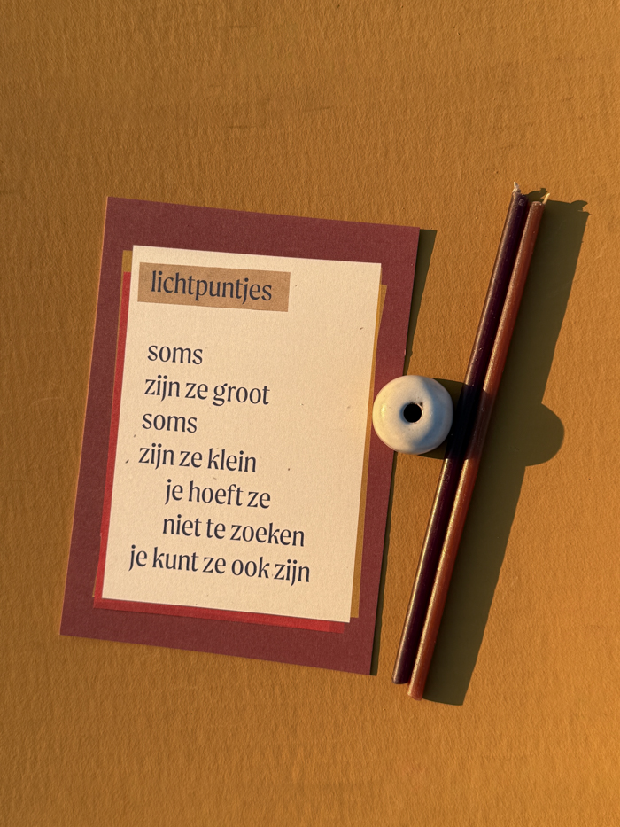 This special gift box brings the poem to life with the Lichtpuntjes postcard, two mini candles and a mini ceramic candle holder. To create a little ritual of light and warmth. The perfect gesture to give or receive, for quiet moments, celebrations, or simply to show someone you care.