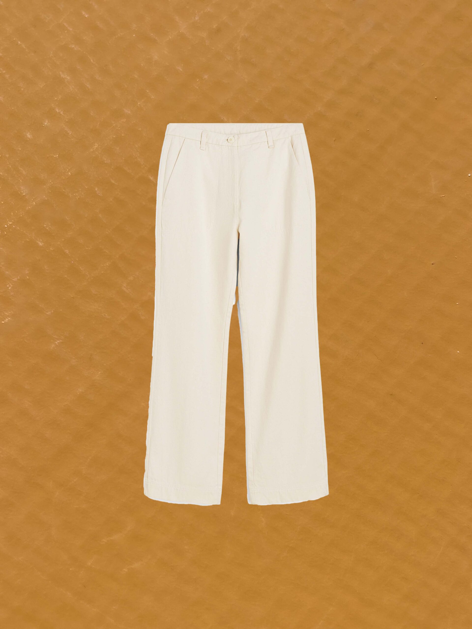 The trousers are designed with a slightly oversized fit, a mid-rise waist, and delicate details such as spacious slant pockets, belt loops, patch back pockets and an embroidered aiayu logo.