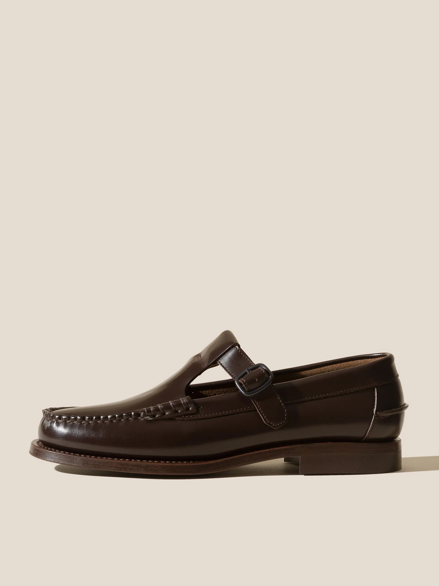 T-bar loafer crafted in Spanish calf leather. Hand-sewn using the traditional moccasin construction. The outsole is stitched to the upper for extra flexibility and durability.